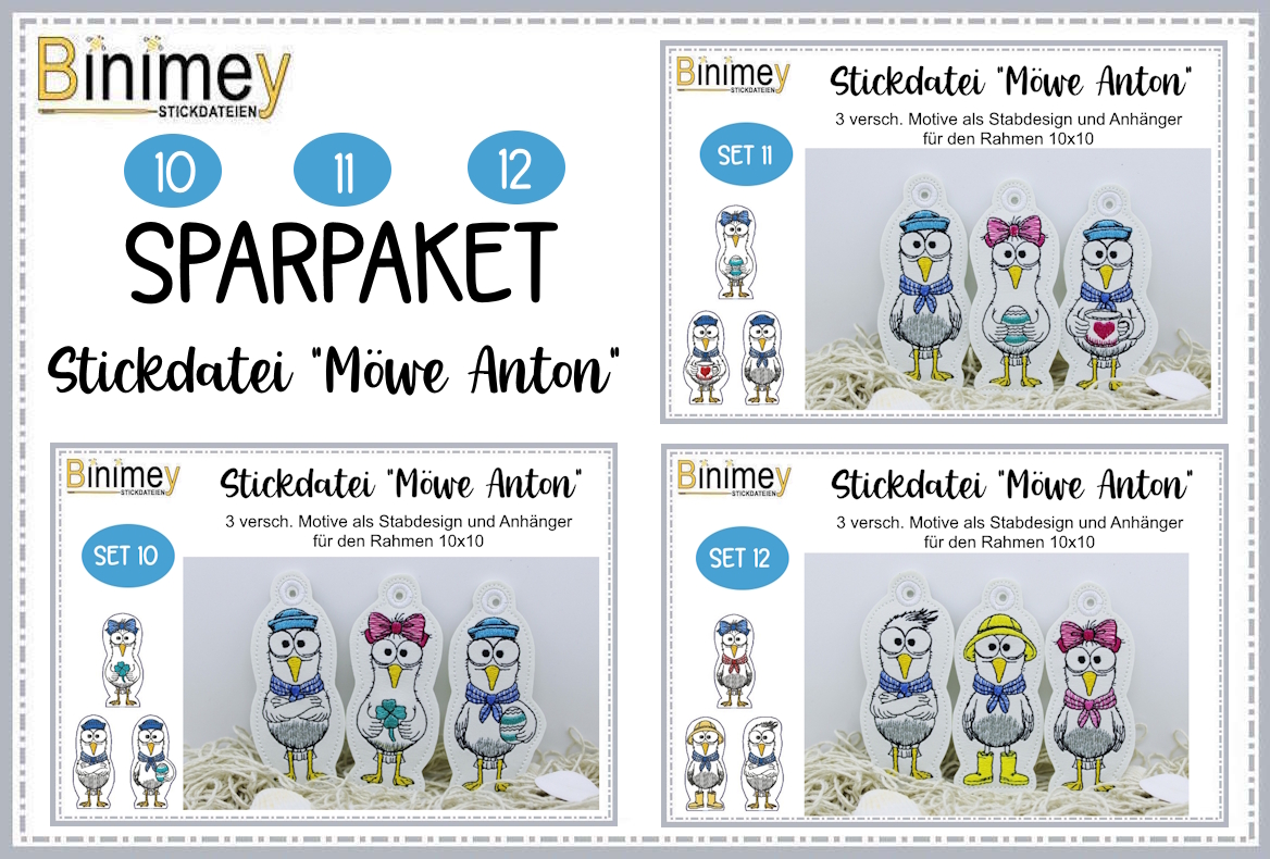 In diesem Sparpaket enthalten sind Stickdateien Set Möwe Anton 10, 11 und 12. Eine genaue Dateiübersicht findest du in den Produktfotos.